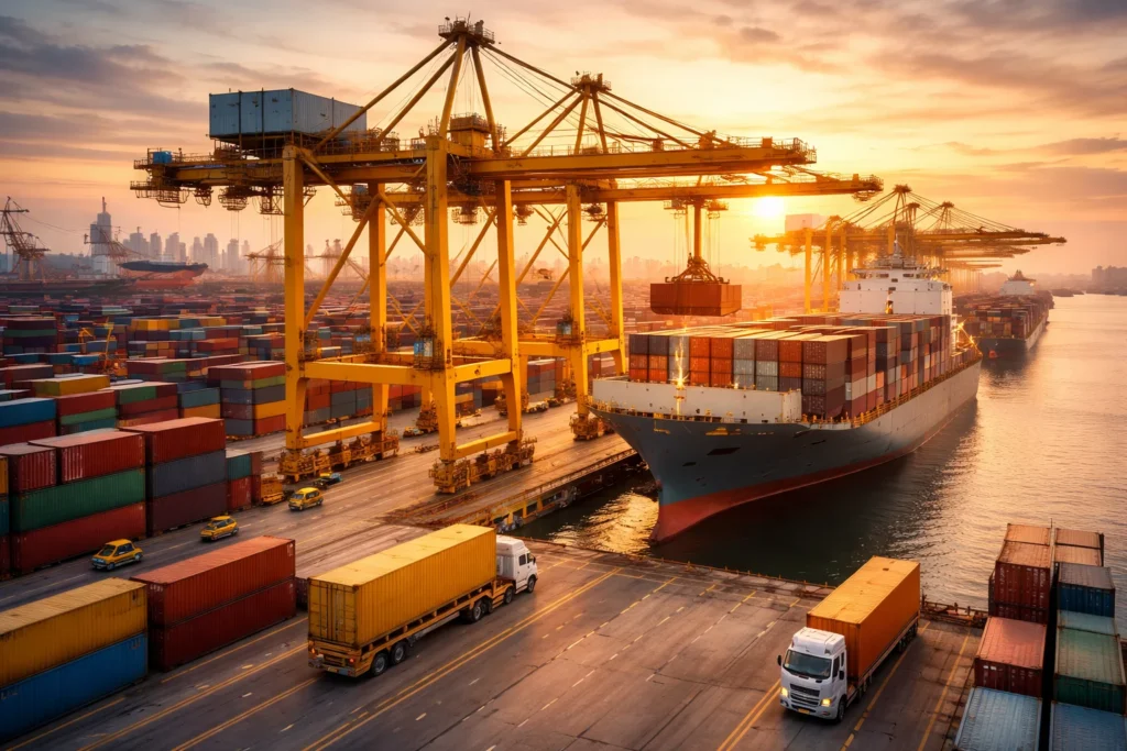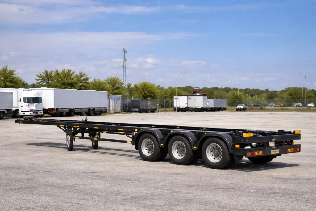 A trailer designed for moving containers and cargo safely and efficiently within port facilities.