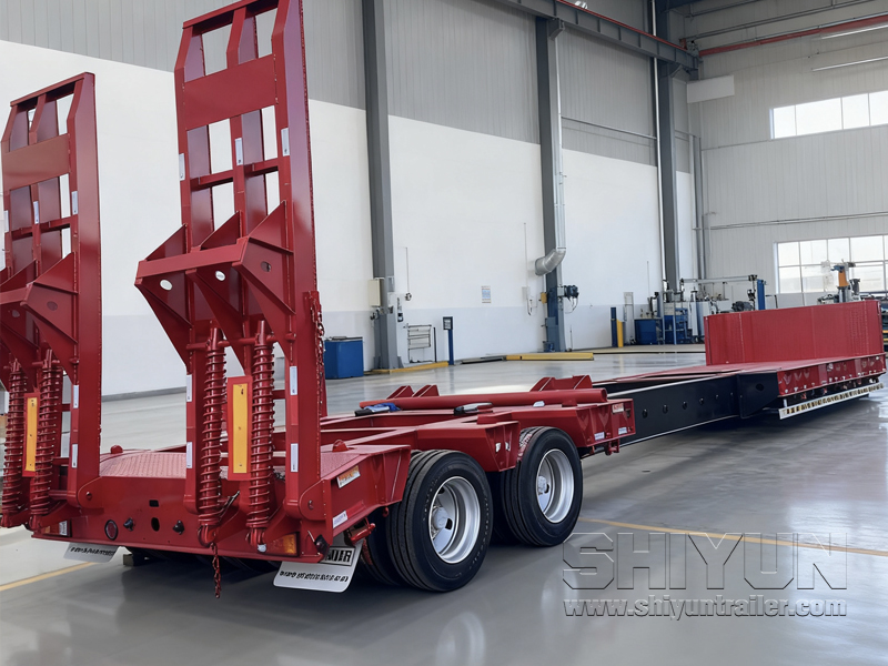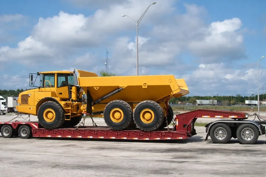 A robust lowbed trailer designed for transporting oversized machinery and heavy equipment safely across complex project sites.