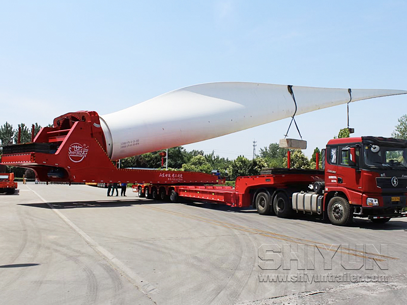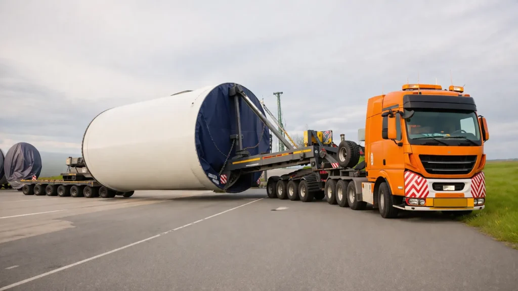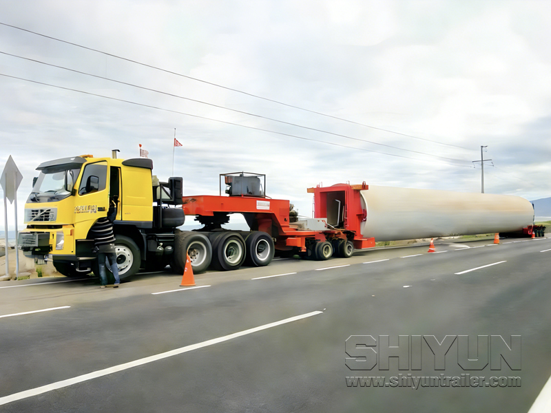 A specialized trailer designed for transporting wind turbine components such as blades, towers, and nacelles safely and efficiently across project sites.