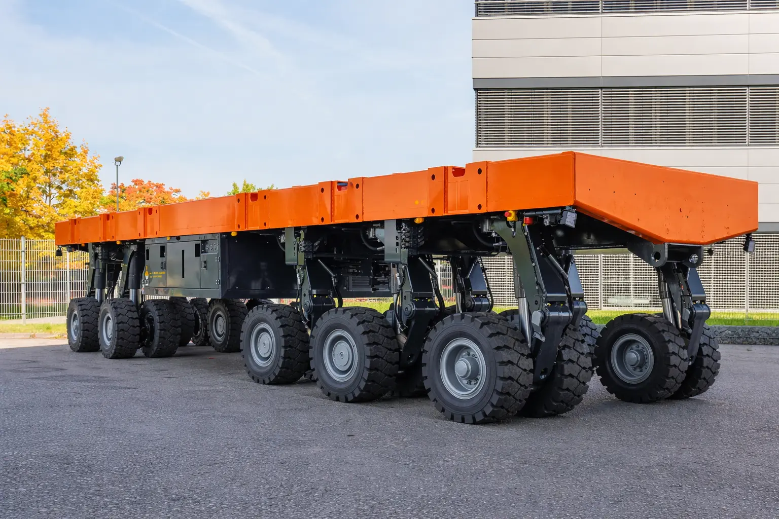 A self-propelled modular transporter designed for moving extremely heavy and oversized loads, providing precise control and maneuverability for safe handling in complex environments.